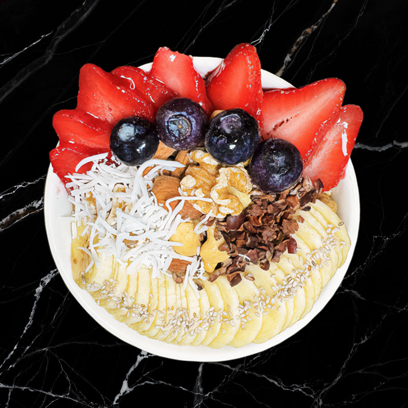 イチゴ・ブルーベリー・バナナ・カカオニブ・ミックスナッツ・ココナッツロング・ホワイトチアシード フレッシュなストロベリーとクリームが絶妙なバランスで楽しめるボウル。